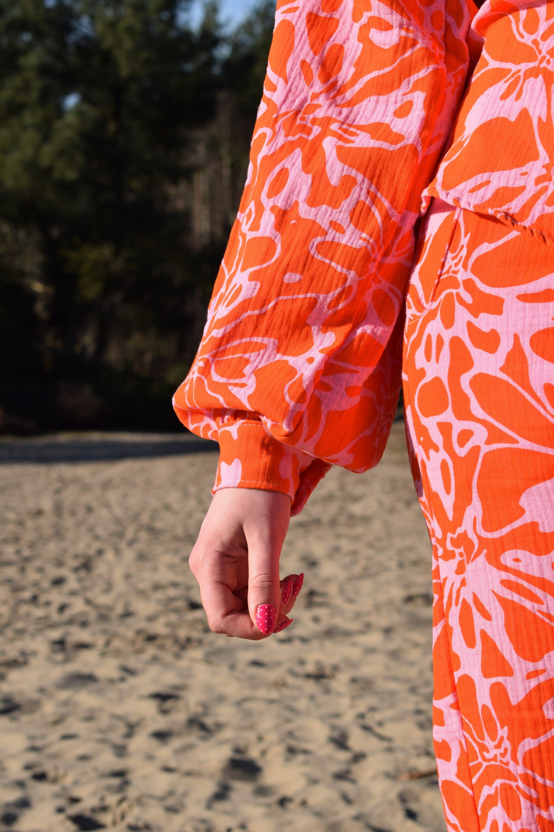 Luchtige blouse van zachte mousseline (100% katoen). De rode stof met abstracte bloemenprint geeft een speelse en vrouwelijke uitstraling. Dankzij de ademende kwaliteit is deze blouse comfortabel om te dragen in het voorjaar en de zomer.